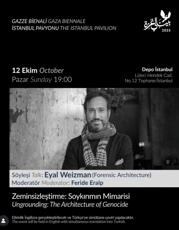 Gazze ve Filistin’in yanı sıra farklı coğrafyalarda yaşayan 50’den fazla sanatçının eserlerini sunan “Gazze Bienali – İstanbul Pavyonu” kapsamında 12 Ekim Pazar 19:00’da mimar Eyal Weizman ile “Zeminsizleştirme: Soykırımın Mimarisi” adlı söyleşi yapılacak.