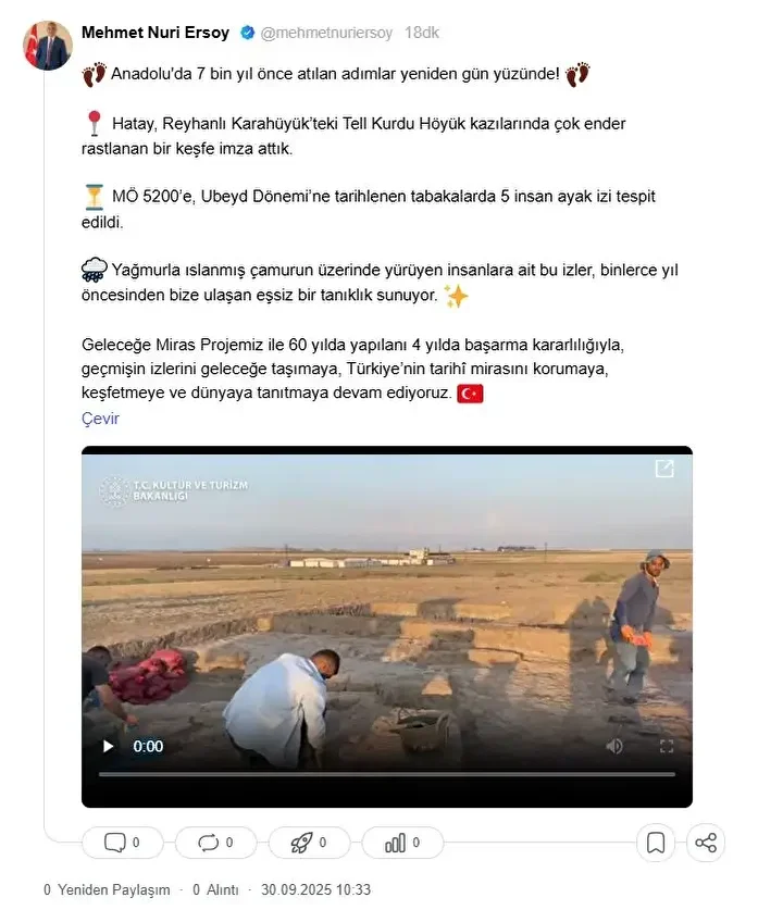 “Milattan önce 5200’e, Ubeyd Dönemi’ne tarihlenen tabakalarda 5 insan ayak izi tespit edildi. Yağmurla ıslanmış çamurun üzerinde yürüyen insanlara ait bu izler, binlerce yıl öncesinden bize ulaşan eşsiz bir tanıklık sunuyor. Geleceğe Miras Projemiz ile 60 yılda yapılanı 4 yılda başarma kararlılığıyla, geçmişin izlerini geleceğe taşımaya, Türkiye’nin tarihi mirasını korumaya, keşfetmeye ve dünyaya tanıtmaya devam ediyoruz.”
